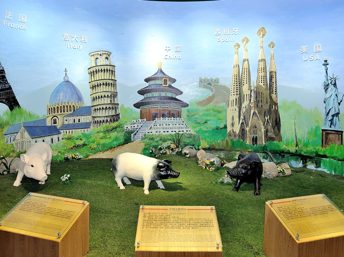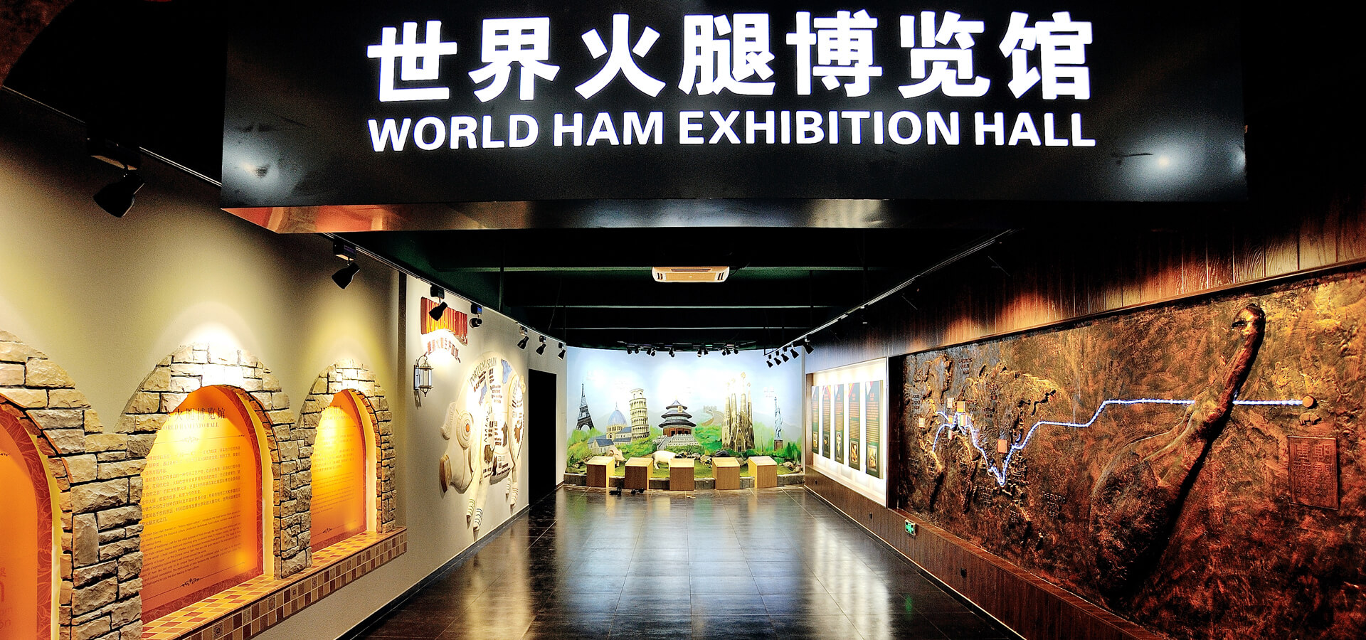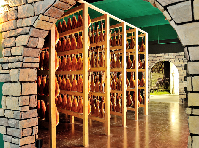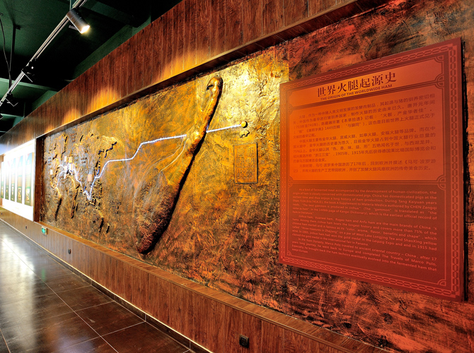 世界火腿博覽館是一個(gè)以世界火腿為主題的博覽館,用歷史-地域-工藝-文化為線索,通過(guò)展板、照片、聲光和布景等手法,翔實(shí)介紹了中國(guó)金華火腿、西班牙伊比利亞火腿、意大利帕爾瑪火腿、法國(guó)科西嘉火腿和巴黎火腿、美國(guó)的鄉(xiāng)村火腿等世界知名火腿的歷史人文,消費(fèi)習(xí)俗、制作工藝、火腿美食等。